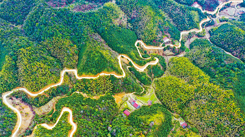 村村通公路,組組能通達,戶戶有便道,農村公路建設不僅改善了貧困地區群眾的交通出行條件,更成為一條條脫貧路、致富路、鄉村振興路。圖為2020年1月22日航拍的江西省吉安市泰和縣老營盤鎮富足村“四好農村路”——竹富公路。它蜿蜒盤旋在延綿的大山間,成為該村的主要進出道路。 人民圖片 鄧和平/攝