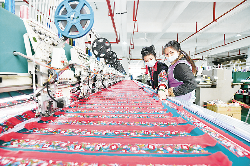 貴州省各地扶貧車間在做好疫情防控的同時,陸續復工復產。圖為2020年3月30日從江縣貫洞鎮的工人在扶貧車間生產民族繡品。 新華社記者 楊文斌/攝