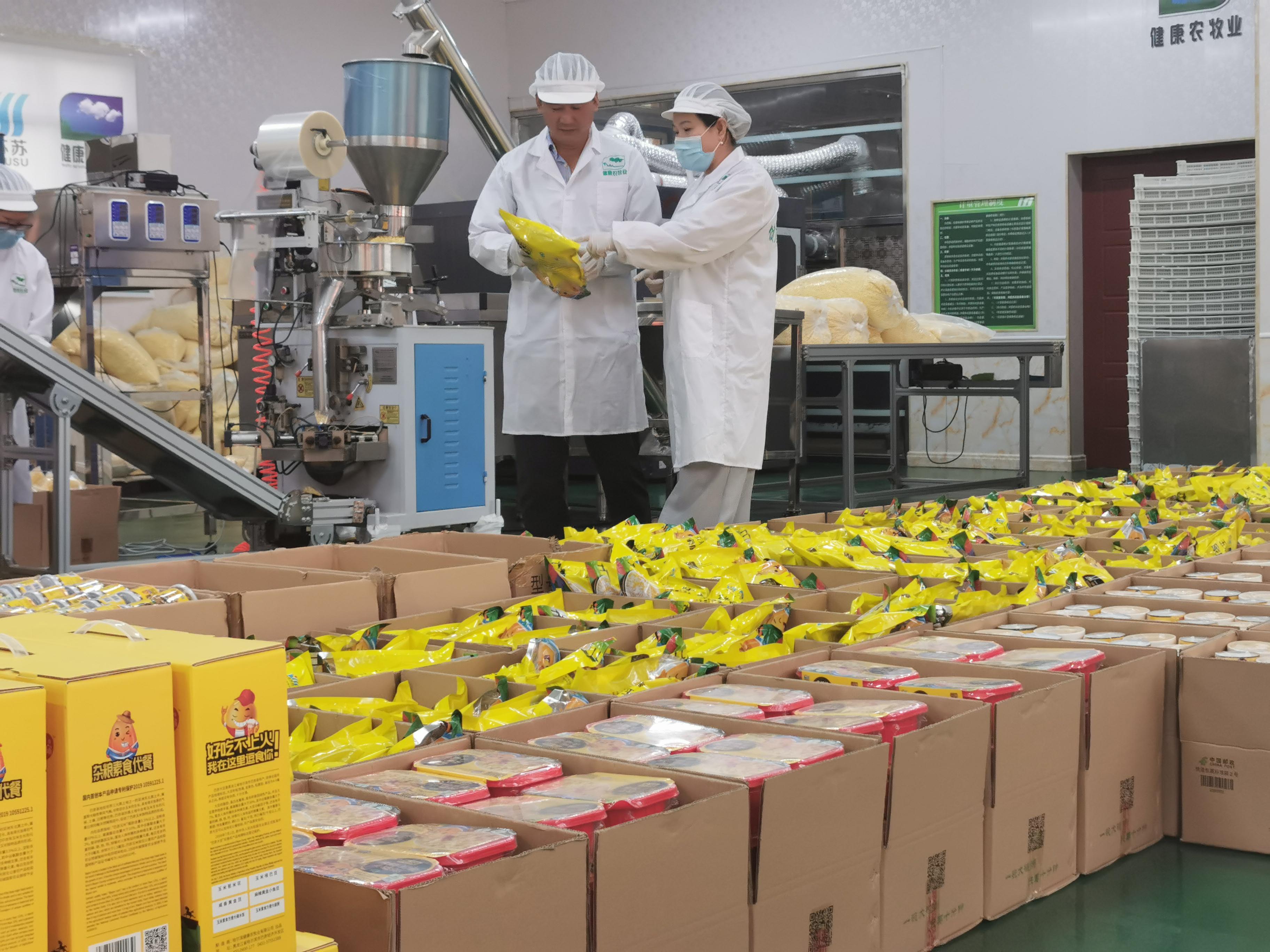 馬金柱提到的企業是哈爾濱健康農牧業有限公司。在企業車間,3條生產線馬力全開,一粒粒玉米經過一道道加工完成“變形”,各種玉米即食產品從這個小山村銷往北京、上海、深圳等地。企業董事長孫立娟指著一個蓋著金色蓋子的盒子說,這款主打的“方便玉米大碴粥”是專利產品,和市面上自發熱小火鍋是一個原理,市場前景不錯。