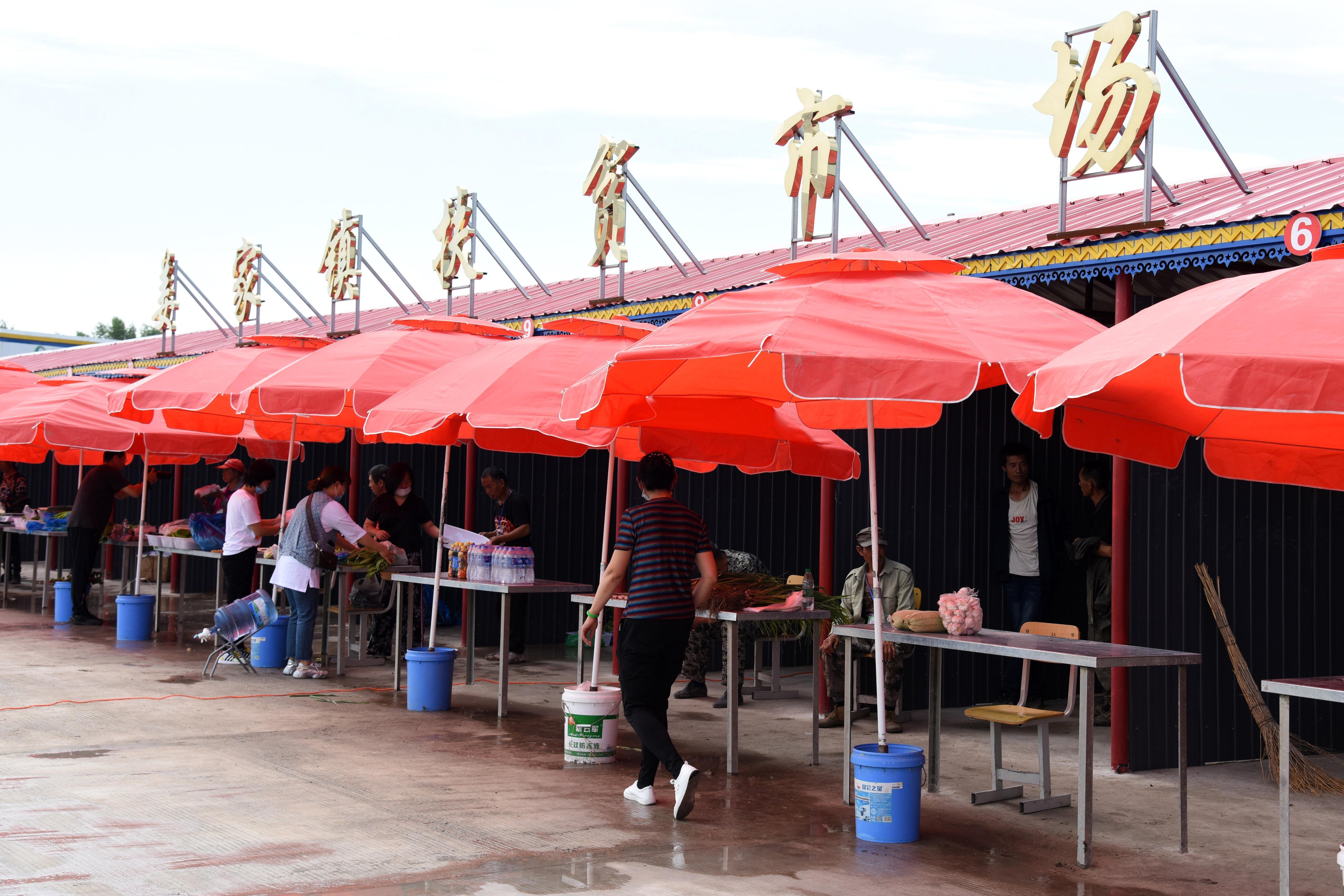 這是黑龍江省肇東市姜家鎮扶貧市場的脫貧戶銷售攤位(7月6日攝)。