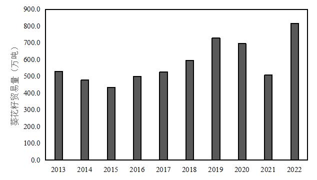從貿易看。2013—2022年,我國葵花籽進出口貿易均呈增長態勢,出口以食用葵花籽為主,出口量由19萬噸增至44萬噸,年均增速近10%,主要出口市場包括伊朗、伊拉克、阿聯酋、俄羅斯和越南。進口以油用葵花籽為主,進口量由1828噸增至19.5萬噸,年均增速達68%,主要進口來源包括哈薩克斯坦、保加利亞和俄羅斯,我國葵花籽貿易一直保持順差。