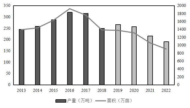 從生產看。葵花籽是我國八大油料作物之一,產量僅次于花生、油菜籽、大豆和棉籽,排在第五位。近十年,我國葵花籽種植面積和產量整體呈先升后降趨勢,2016年兩者均達到歷史高點,分別為128萬公頃和320萬噸,2022年種植規模萎縮,產量降至190萬噸。我國葵花籽種植主要分布在內蒙古自治區、新疆維吾爾自治區和甘肅省,合計產量占全國總產量的80%以上,其中內蒙古種植規模逐年擴大,目前占到全國六成左右。