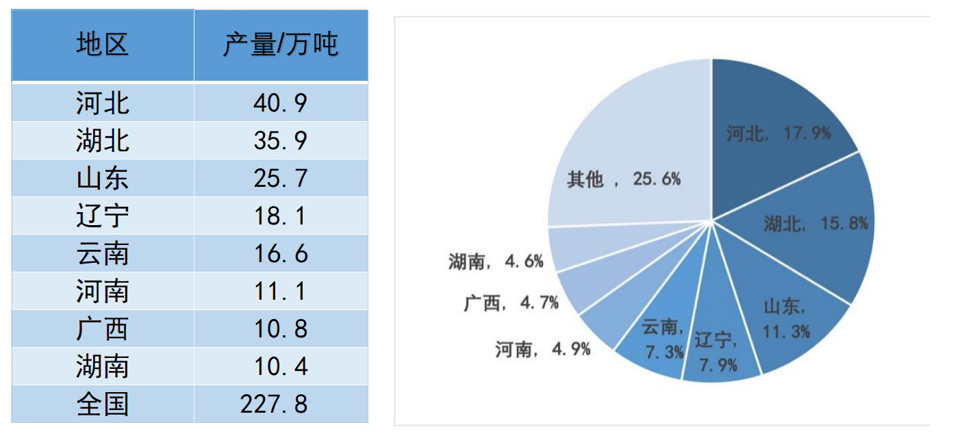 我國(guó)目前是世界上最大的板栗生產(chǎn)國(guó),2018以來(lái),板栗年產(chǎn)量一直保持在200萬(wàn)噸以上,占全球總產(chǎn)量的90%以上。根據(jù)國(guó)家林業(yè)和草原局統(tǒng)計(jì)年鑒顯示,2021年,我國(guó)板栗總產(chǎn)量227.8萬(wàn)噸,種植分布在全國(guó)23個(gè)省份,河北、湖北、山東、遼寧、云南和河南等地為主要產(chǎn)區(qū),其中河北板栗產(chǎn)量40.9萬(wàn)噸,占全國(guó)總產(chǎn)量的17.9%,位居全國(guó)第一(見圖2)。