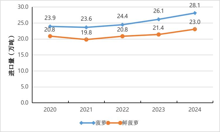 我國菠蘿進口來源高度集中,菲律賓是我國最大的進口來源地。2024年,我國菠蘿進口量為28.1萬噸,其中鮮菠蘿進口量23.0萬噸,前三大進口市場分別是菲律賓、印度尼西亞和泰國,進口量分別為23.5萬噸、2.5萬噸和1.2萬噸,合計占進口總量的96.9%。