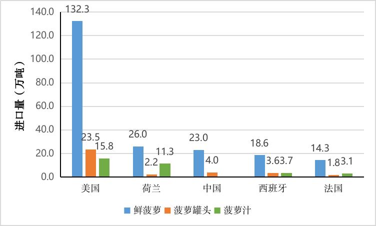 美國和歐盟是菠蘿的主要消費市場。2024年,全球前五大菠蘿進口國是美國、荷蘭、中國、西班牙和法國,進口量分別是171.6萬噸、39.4萬噸、27.1萬噸、25.9萬噸和19.3萬噸。