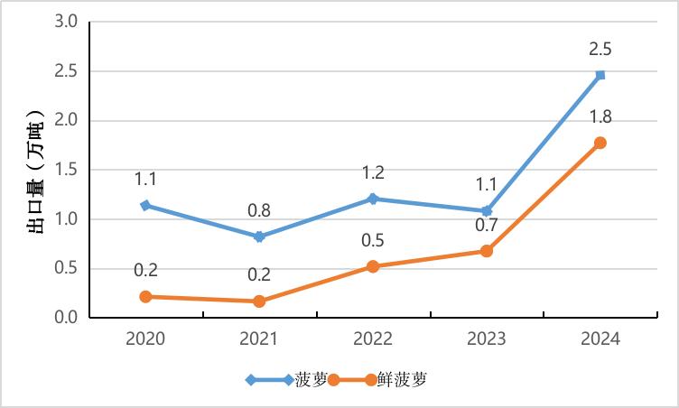 我國菠蘿貿易以鮮菠蘿為主,長期保持逆差。近年來,吉爾吉斯斯坦進口量快速增長,已成為我國菠蘿最大的出口市場。2024年,我國菠蘿出口量為2.5萬噸,其中鮮菠蘿出口量1.8萬噸,我國菠蘿前三大出口市場分別是吉爾吉斯斯坦、俄羅斯和美國,出口量分別為1.3萬噸、0.4萬噸和0.1萬噸,合計占出口總量的73.6%。