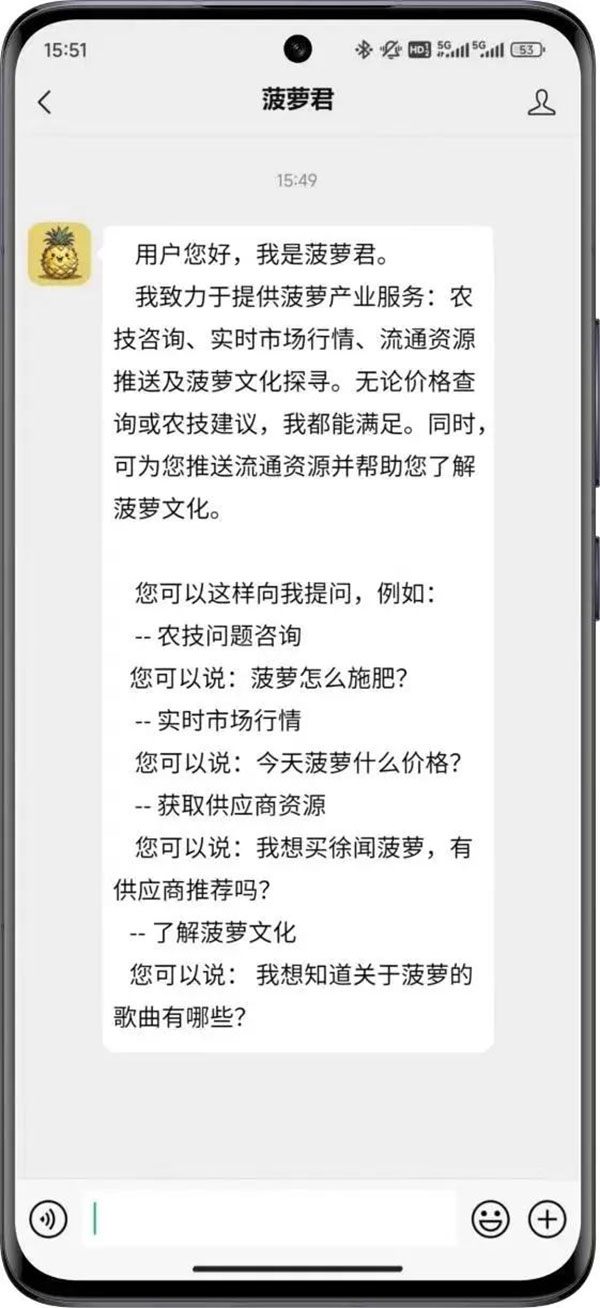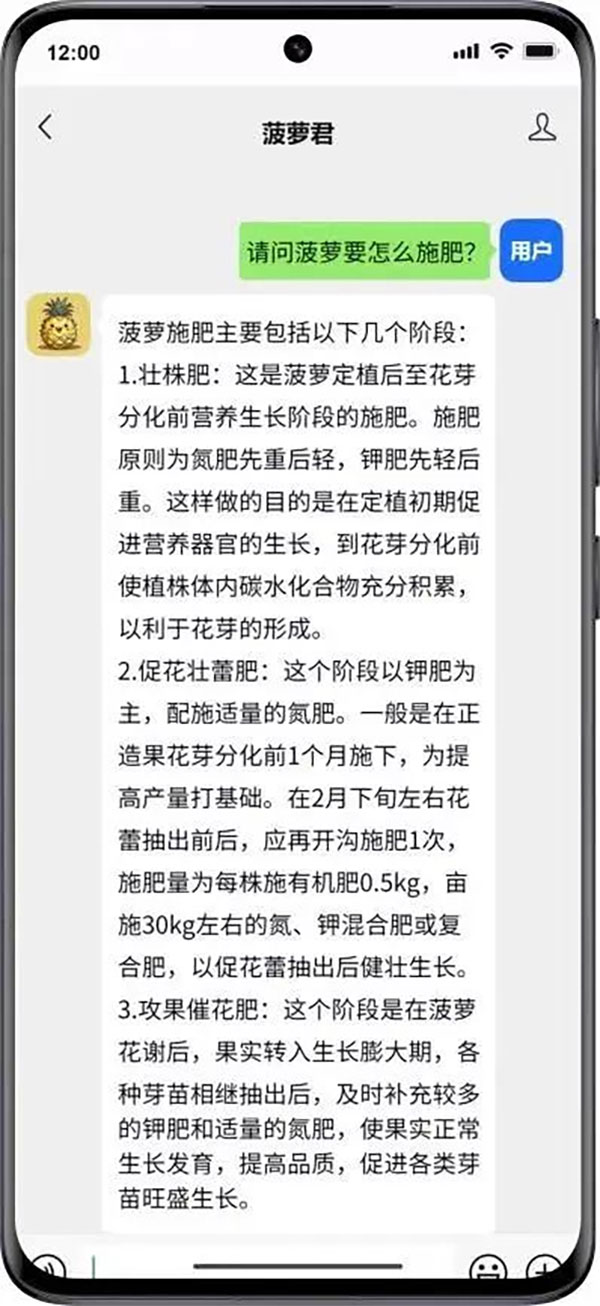 “菠蘿君”和“高智荔”AI機(jī)器人將全天候服務(wù)農(nóng)業(yè)從業(yè)者,助力解決產(chǎn)前、產(chǎn)中、產(chǎn)后各環(huán)節(jié)難點(diǎn)問(wèn)題,推動(dòng)農(nóng)業(yè)產(chǎn)業(yè)高質(zhì)量發(fā)展!