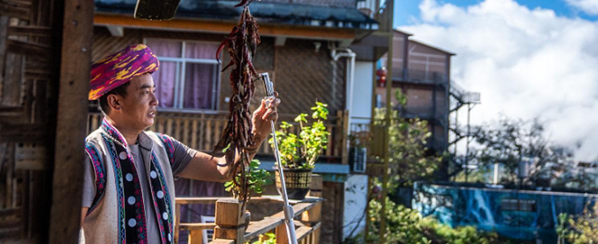 在云南省怒江州福貢縣匹河怒族鄉老姆登村,怒族群眾郁五林在自家開的客棧直播怒江大峽谷美景(11月3日攝)。