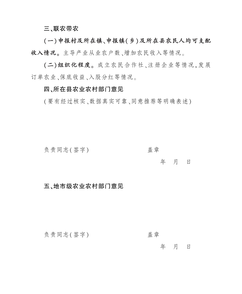 第十條 縣級農(nóng)業(yè)農(nóng)村部門對村(鎮(zhèn))申報材料審核把關(guān),加蓋公章后報送地市級農(nóng)業(yè)農(nóng)村部門。同時,提供產(chǎn)值、人均可支配收入等證明材料。對村(鎮(zhèn))在線填報信息審核把關(guān),提交地市級農(nóng)業(yè)農(nóng)村部門審核。
