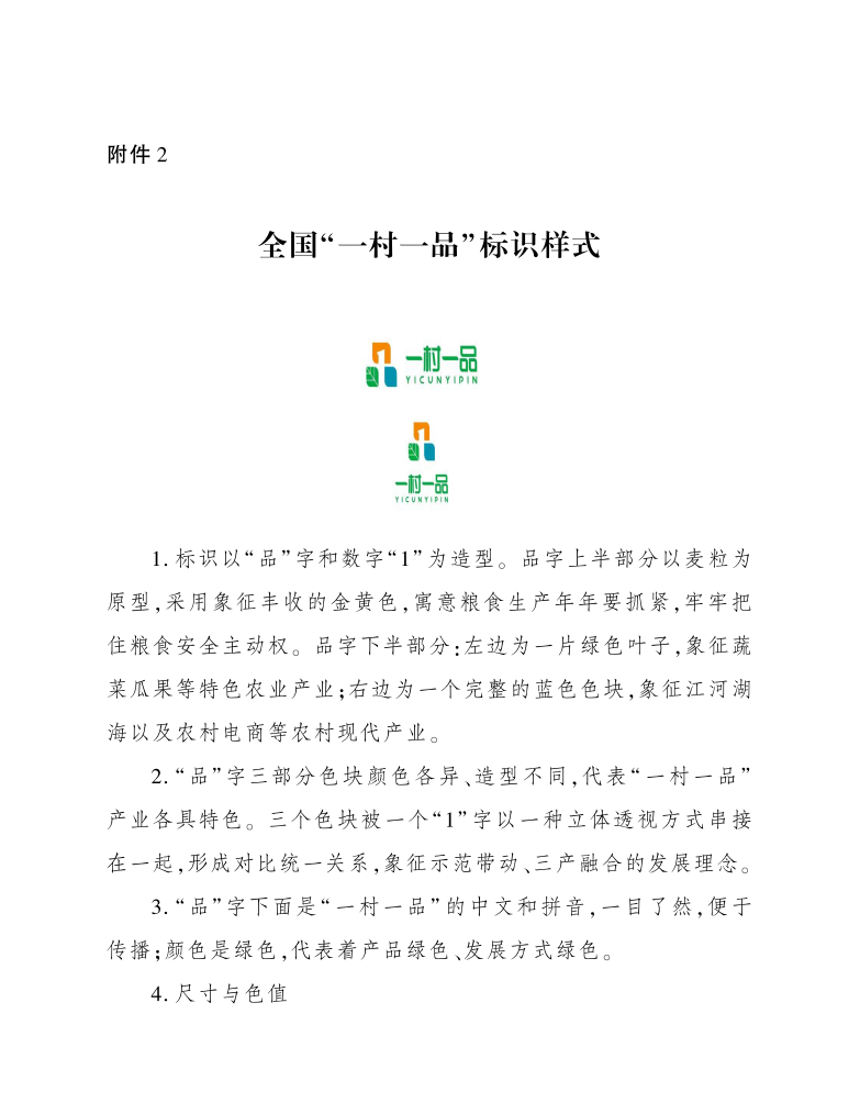 1.全國“一村一品”示范村鎮(zhèn)內(nèi)的生產(chǎn)、經(jīng)營、服務(wù)主體對外宣傳印制全國“一村一品”標識,樣式須符合附件2內(nèi)容要求;