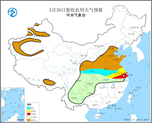 預計5月30日,安徽中南部、江蘇中南部等地有小到中雨、局地大雨,不利于機收作業和已收作物晾曬,夏收氣象等級為次適宜到不適宜(圖3);其余地區夏收氣象等級為適宜。
