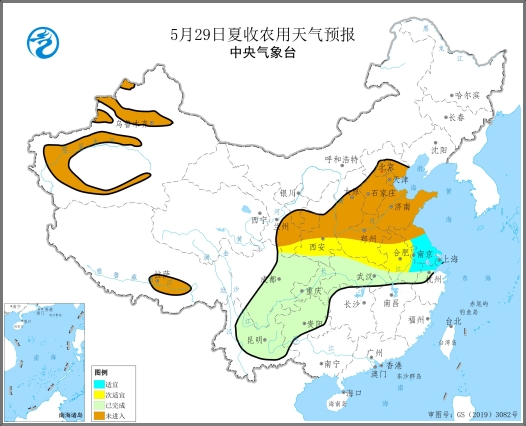 預計5月29日,甘肅南部、陜西南部、河南南部、安徽中部等地夏收區有小雨,對機收作業略有不利,夏收氣象等級為次適宜(圖2);江蘇等地多晴好天氣,夏收氣象等級為適宜。