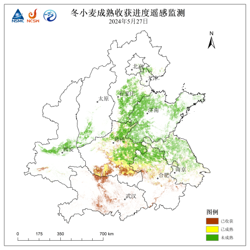 5月27日風云衛星遙感監測顯示,西北地區、華北、黃淮大部以及江淮北部和東部等地冬小麥處于灌漿乳熟階段,黃淮西南部、江淮西南部處于成熟收獲期;江漢大部冬小麥已收獲(圖1)。