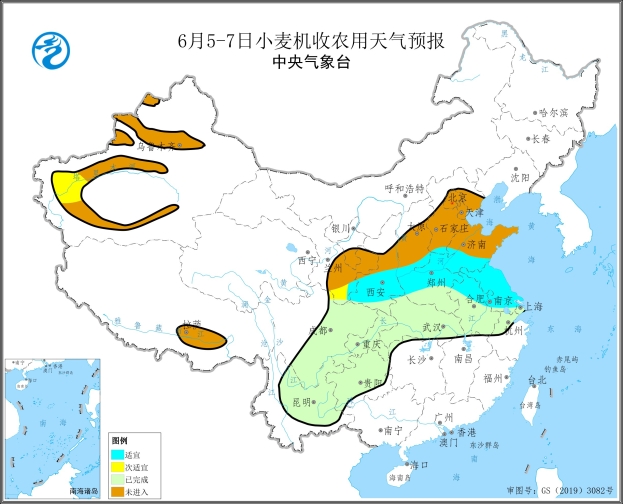 預計6月5-7日,陜西中南部、山西南部、河南北部、山東南部、安徽北部、江蘇大部等麥收區天氣晴好,利于加快機收作業進度,夏收氣象等級為適宜;新疆西部、甘肅南部多雷陣雨或小雨天氣,對麥收作業略有影響,夏收氣象等級為次適宜(圖2)。