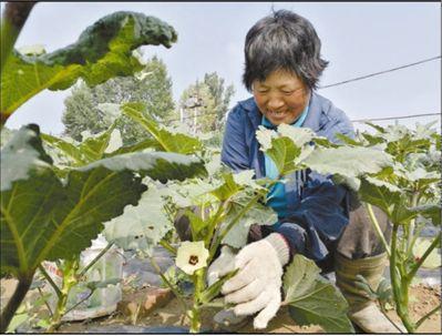河北省灤平縣于營村村民在秋葵園地采摘新鮮的秋葵。霍騰達攝