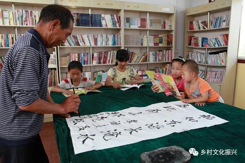 老農(nóng)楊連存在圖書(shū)室和孩子們一起練書(shū)法