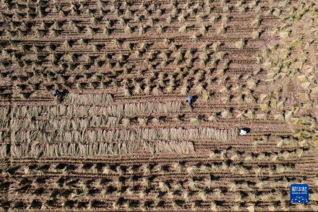 種植戶在杭州市富陽區漁山鄉糧食生產功能區的稻田內捆扎秸稈(2022年10月19日攝,無人機照片)。 新華社記者 徐昱 攝