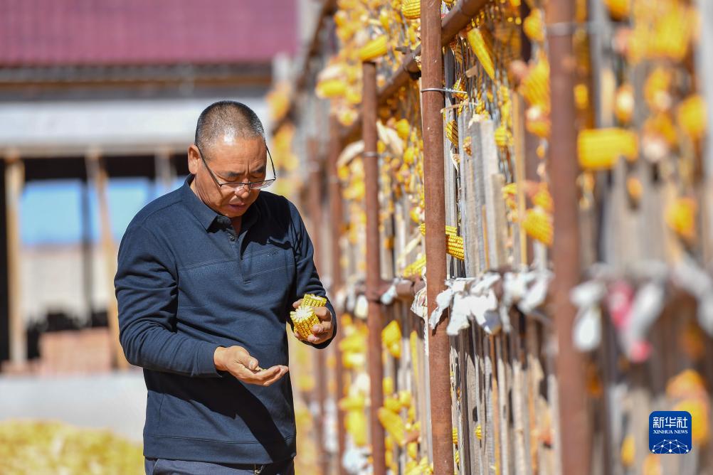 在吉林省公主嶺市友忠種植農民專業合作社,理事長孫友忠查看科學儲糧倉中的玉米儲存情況(2023年10月19日攝)。 新華社記者 張楠 攝