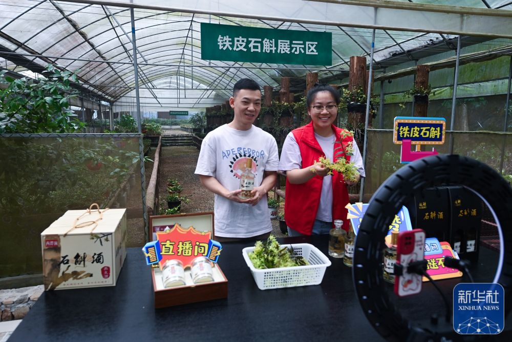 ↑2023年6月8日,在諸暨市東白湖鎮的鐵皮石斛有機種植基地,基地負責人孫思寶(左)和志愿者一起直播賣鐵皮石斛花茶、鐵皮石斛酒等產品。鐵皮石斛和果蔬是浙江省諸暨市東白湖鎮的特色農業產業。