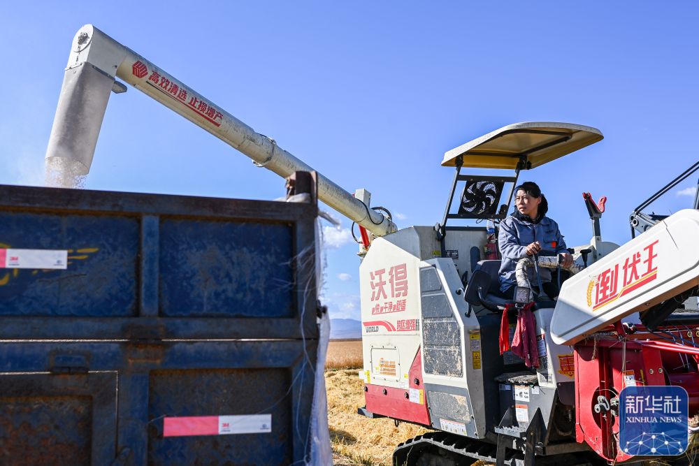 ↑2023年10月20日,“80”后劉春艷在琿春市三家子滿族鄉東崗子村的水稻田里駕駛收割機收割水稻。劉春艷2013年創建春艷種植專業農場,目前農場已實現生產、加工、銷售融合發展,實現了5000畝水稻、玉米、大豆全程機械化作業,水稻年產量達到3000噸,年產值達2500多萬元。