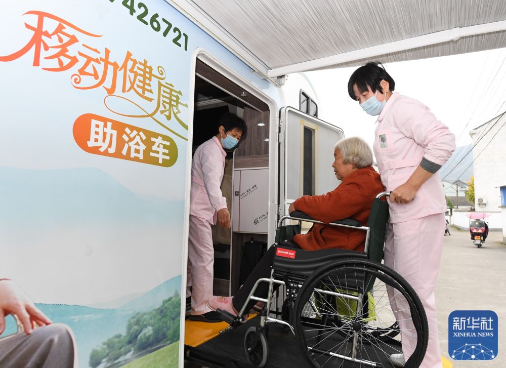 ↑2023年11月30日,在浙江省余姚市梁弄鎮甘宣村,一家結對幫扶的養老機構將助浴車開到村民家門口,為行動不便的老人洗浴。為推進鄉村養老工作,促進公共服務均衡覆蓋,浙江省余姚市自今年7月起啟動專項行動,發動服務機構、社會組織等向山區輸送養老服務。