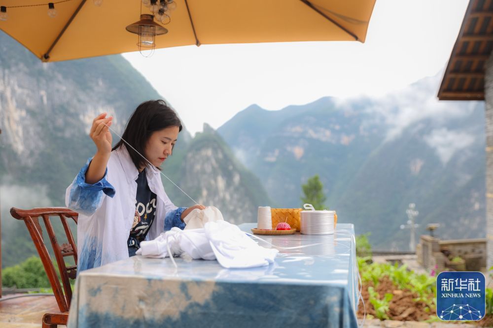 ↑2023年10月10日,在重慶市巫山縣竹賢鄉下莊村,31歲的袁孝鑫在創作扎染圖案。袁孝鑫是下莊村人,大學畢業后一直在重慶城區工作。2022年初,袁孝鑫回到家鄉,創辦“下莊布谷”植物扎染工坊。袁孝鑫表示,未來她將在家鄉大力發展扎染產業,傳承非遺文化,為鄉村振興貢獻力量。