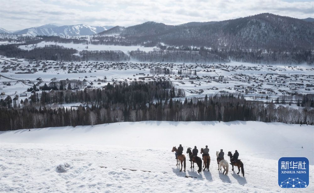 ↑2023年3月30日,新疆阿勒泰地區禾木村觀光馬隊農民專業合作社隊員騎馬走在禾木村后山的觀景平臺上,商議未來的發展(無人機照片)。禾木村擁有“中國十大最美鄉村”的稱號,每年游客絡繹不絕,2022年,禾木村村民人均純收入達4.4萬元。目前,這個一千多人的小山村已經擁有22家酒店、169家民宿、19家餐廳和32家商店。參加馬隊是村民們重要的經濟來源之一,每戶村民都可以帶兩匹馬參加到馬隊中來,為游客提供服務。