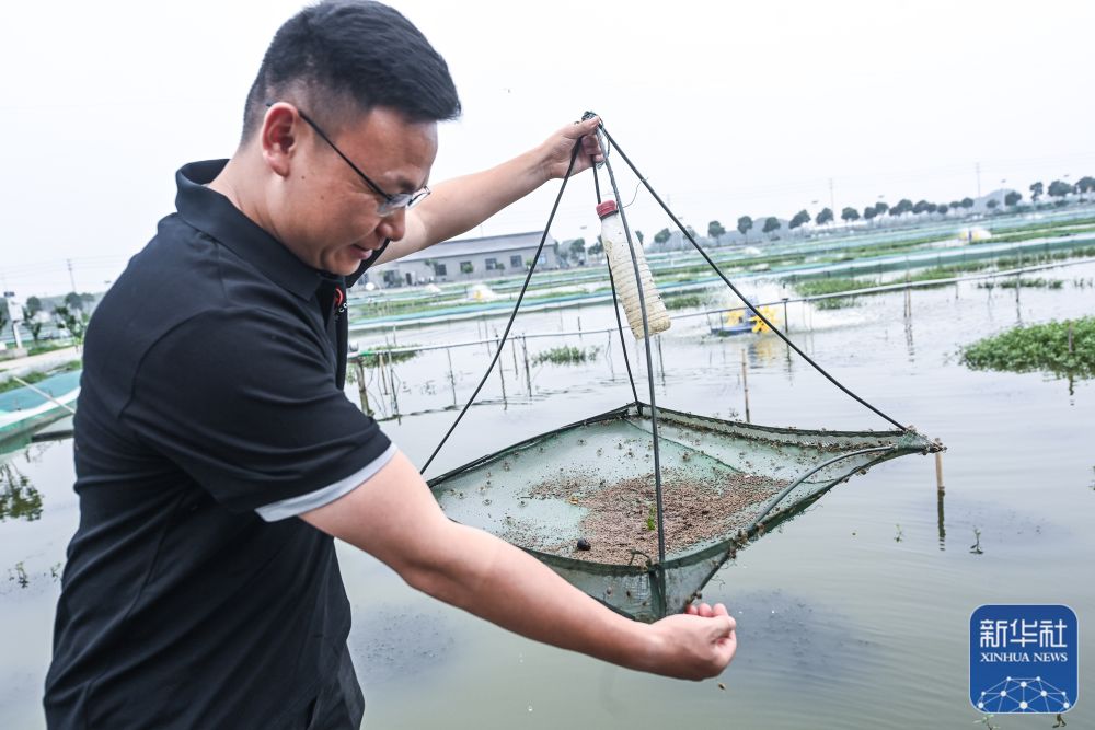 ↑2023年6月1日,欒金祥在浙江省湖州市織里鎮湖星農業科技有限公司的湖蟹養殖基地內查看湖蟹的生長情況。欒金祥是美國紐約州立大學碩士畢業,回國后在家鄉投身現代農業管理,帶動蟹農創收,2022年公司湖蟹養殖銷售額達5000萬元人民幣。