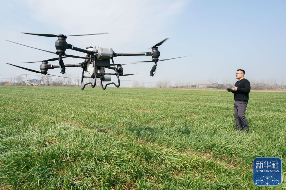 ↑2023年2月28日,王昌在來安縣水口鎮擁巷村操作植保無人機噴灑除草劑。今年27歲的王昌是安徽省滁州市來安縣水口鎮擁巷村人。2018年大學畢業后返鄉,在家人的支持下成立了農機專業合作社,吸納1000余戶農民加入,為當地農民提供農業機械化作業、農業種植技術培訓等服務,帶動周邊村民共同致富。
