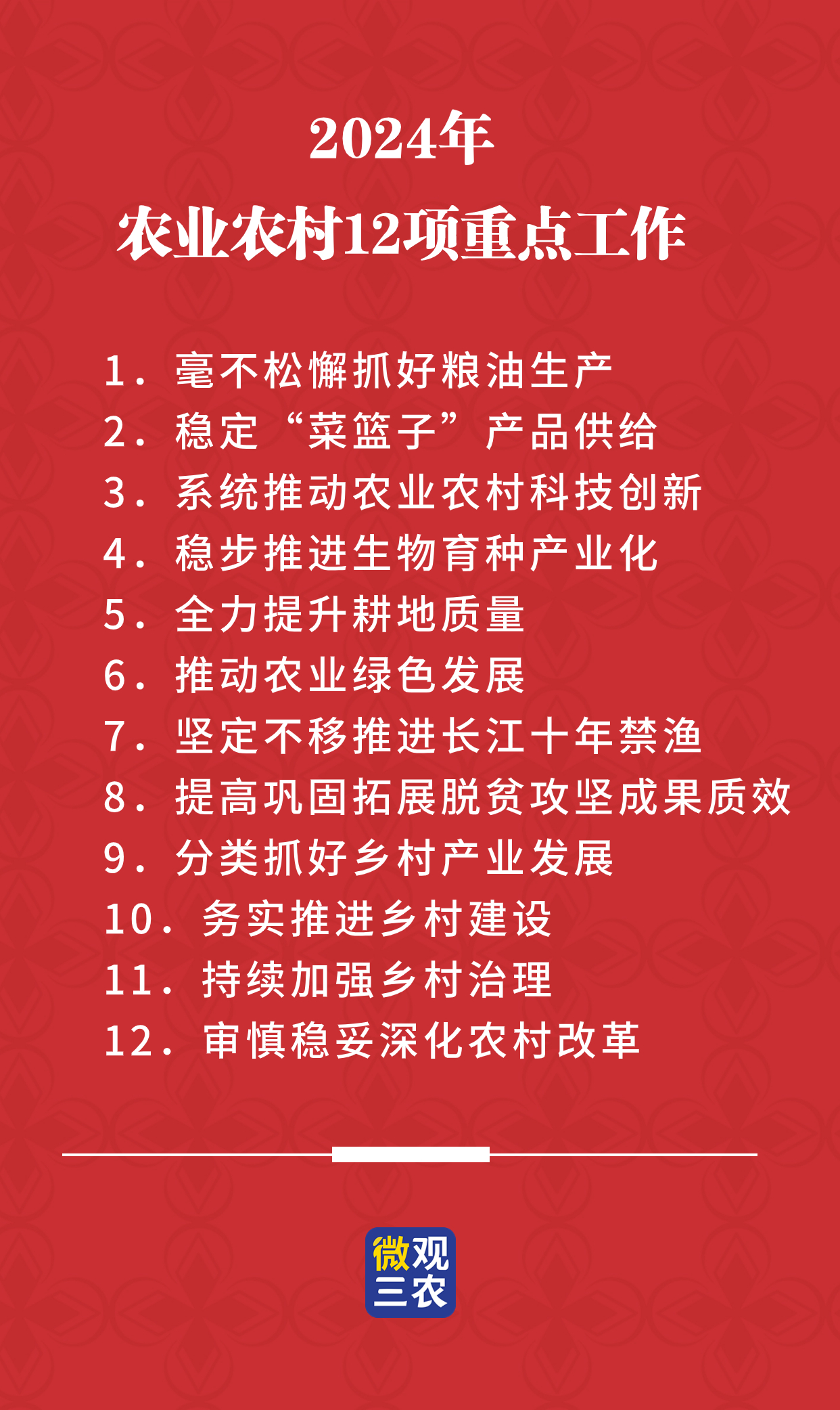 會議強調,要堅持以習近平新時代中國特色社會主義思想為指導,全面貫徹落實黨的二十大和二十屆二中全會精神,深入學習貫徹習近平總書記關于三農工作的重要論述,認真落實中央經濟工作會議、中央農村工作會議部署要求,錨定建設農業強國目標,以學習運用“千萬工程”經驗為引領,著力夯基礎、穩產能、防風險、增活力,堅決守住三農底線,扎實推進鄉村產業發展、鄉村建設、鄉村治理重點任務,努力推動三農工作持續取得新進展新提升。